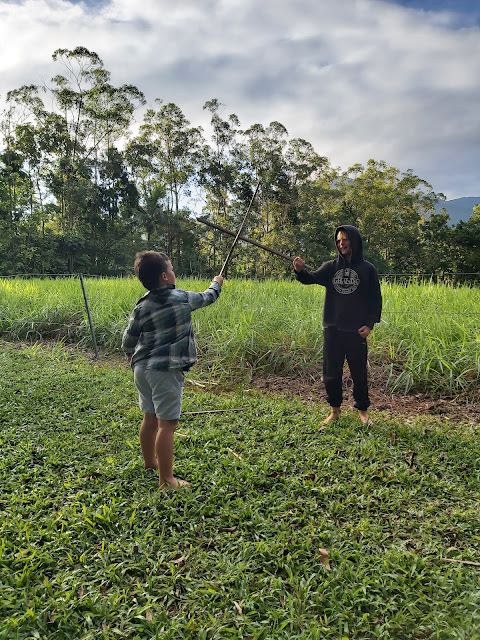 | Jackson and Logan spent hours playing swords with the stems of pandanus plants - trying to work out who found the strongest one! |